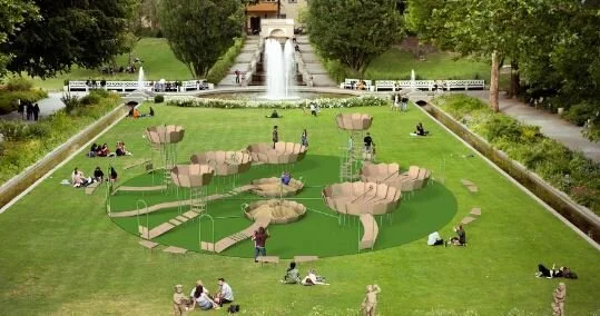 Martin Binder and Claudio Rimmele came up with the Rimbin concept, a space that provides children with individual platforms, allowing them to see, communicate and play games with each other safely. Parents, meanwhile, are able to keep an eye out from a distance.The platforms, inspired by giant water lilies, are modular, meaning that the layout can be configured depending on expected traffic.
